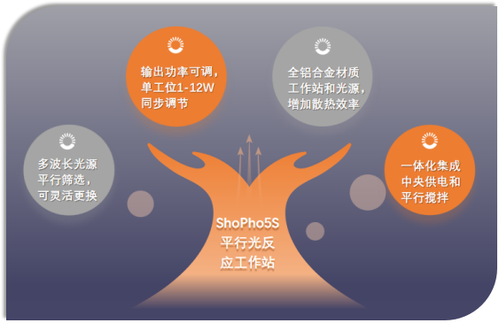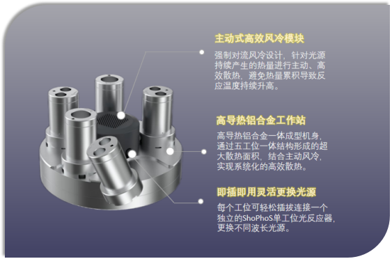 ShoPho5S创新开发集成式平行工作站,可同时为五个独立反应位点集中供电,平行调节光源功率。在完全一致的搅拌、光源功率和温度条件下并行开展多组反应,平行对照的难题,于此迎刃而解。